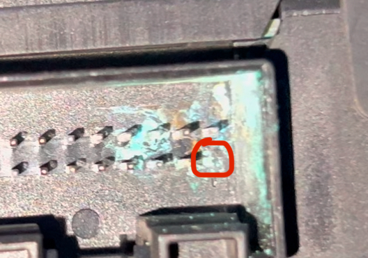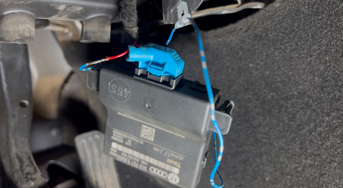 Дальше включаем логику. Кроме двигателя на связь ничего не выходит. Двигатель общается с диагностикой по K-line. Все остальное по CAN. Если по CAN ничего не отвечает, то есть 2 варианта: 1) Полностью лежит CAN шина на массе. 2) Нет питания на блок Gateway. Gateway - блок, через который общаются все остальные блоки между с собой по CAN и LIN шине. Предохранитель целый. Лезем к Gateway. Он находится над педалью газа. Отстегиваю фишку и вижу интересную штуку.