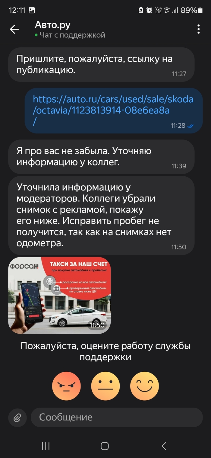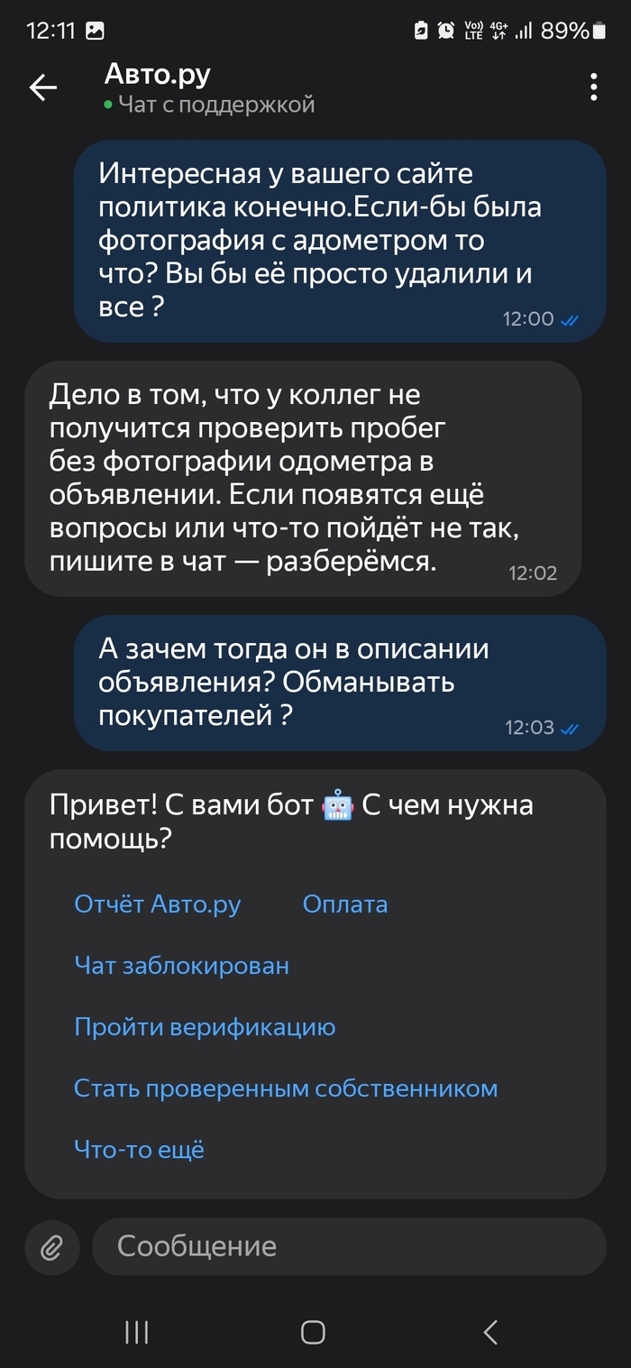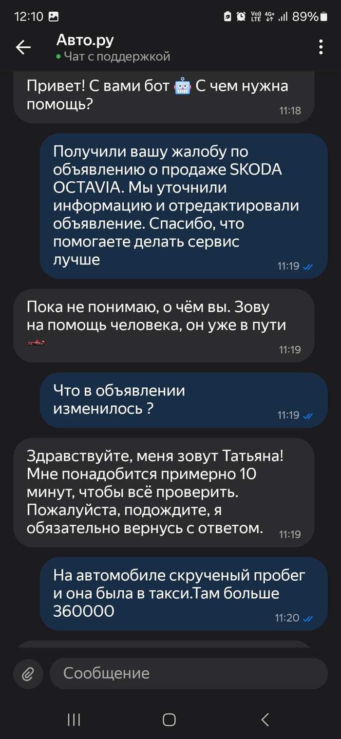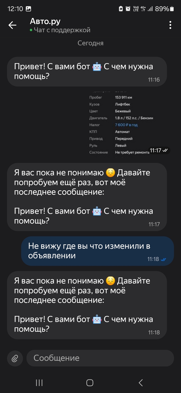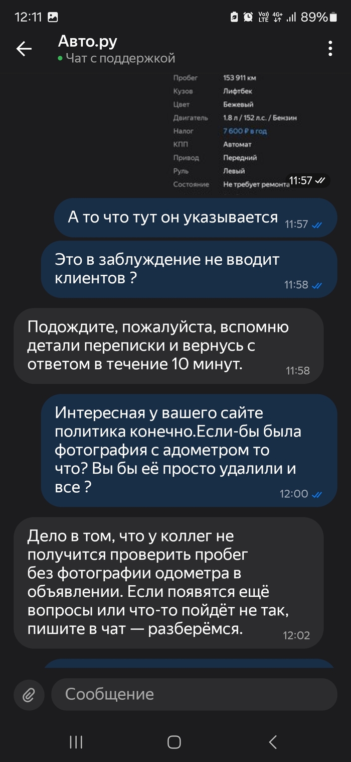 Машину покупал в 2020 году и пробивал ее только через «Автотеку», где на тот момент никакой информации про скрученный пробег или регистрацию в такси не было. Где-то через полгода в сервисе узнал, что на ней скручен пробег со 340 000 до 128 000. Конечно, расстроился, но продолжил ездить и постоянно ремонтировать.В 2024 году после очередной поломки было принято решение о покупке новой машины и сдаче старой в трейд-ин. В одном из автосалонов оказалось, что автомобиль ещё и был в такси. С учётом этого мне предложили за автомобиль 600 000 рублей. Проходит 2 месяца с момента продажи машины в Москве, и я вижу объявление о продаже своей машины в Питере за 1 050 000 с красивой цифрой в пробеге 153 911. Я, как человек, которому небезразлична судьба следующего владельца этого «прекрасного» автомобиля, решил предупредить площадку авто.ру о неточности в объявлении и о недобросовестном продавце, который пытается продать машину значительно дороже, чем она стоит в своем текущем состоянии. На что получаю ответ, который вы можете видеть на скриншотах.