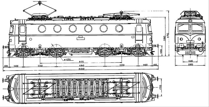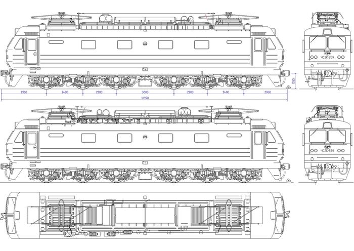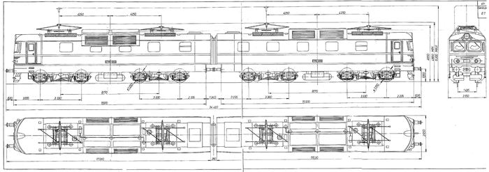 Он должен был представлять собой односекционный электровоз с оригинальным экипажем. Четыре двухосные тележки объединялись попарно в две общие рамы, на которые и опирался кузов.