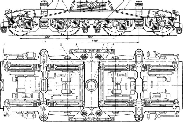 Кузов электровоза установлен на двух двухосных тележках с опорно-рамным приводом II класса — тяговые электродвигатели установлены на раме тележки (подрессорены), а тяговые редукторы стоят на осях колёсных пар.