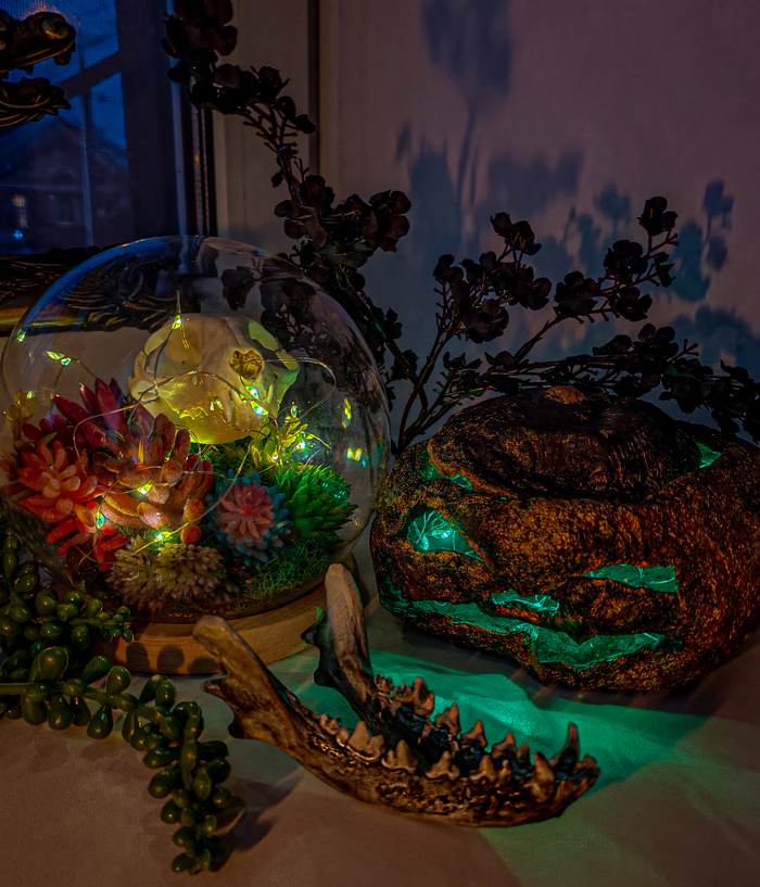 У тыквы был сложный период, где ее сначала опустошили (буквально) ложкой, а потом около недели сушили в духовке и нечаянно чуть не приготовили