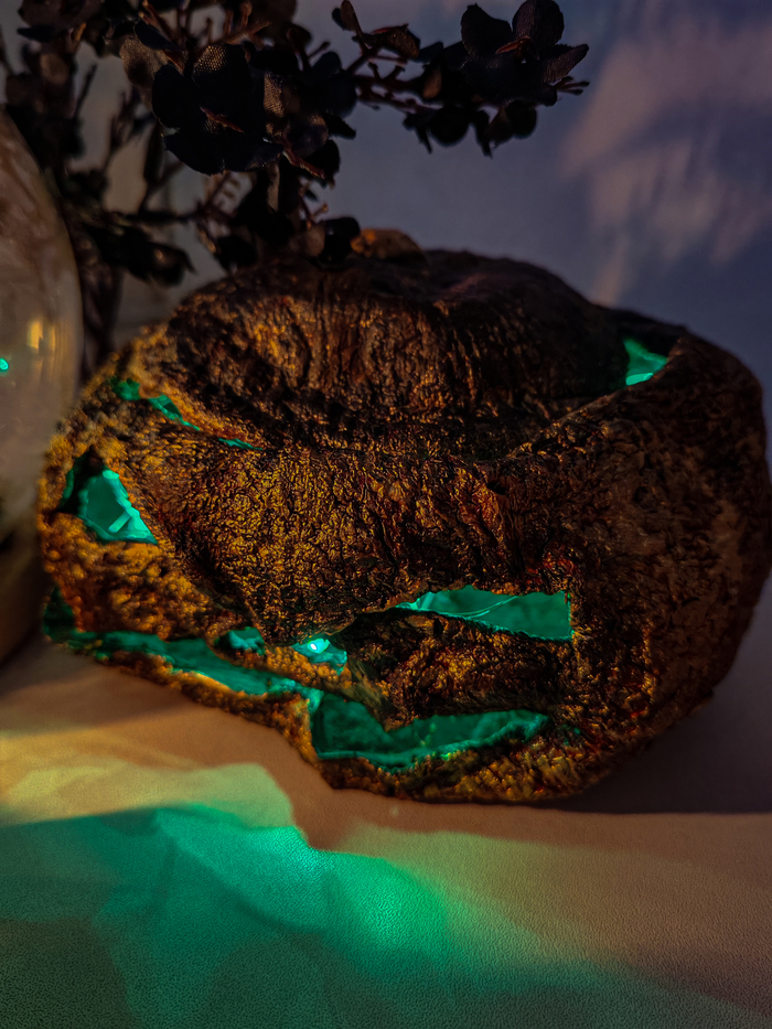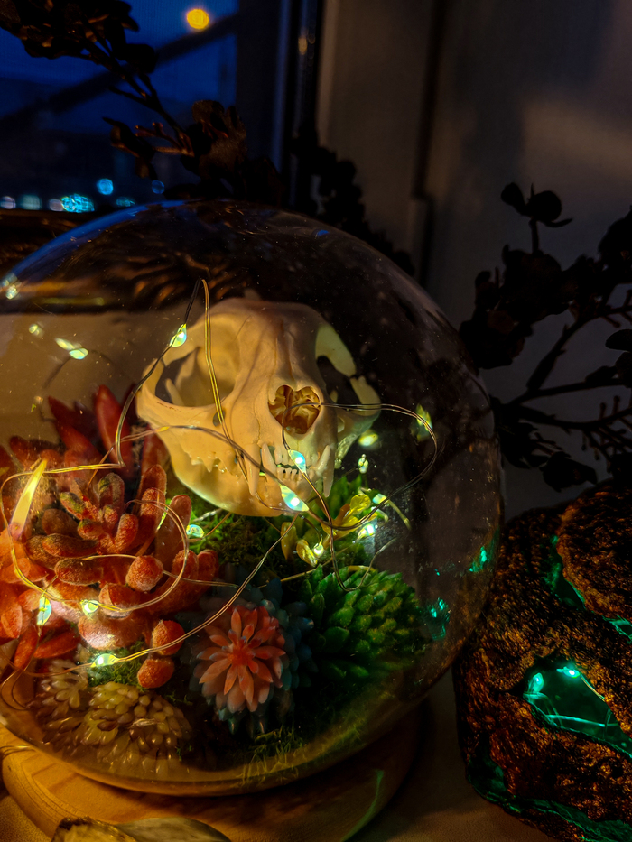 В стекле на подушке из стабилизированного мха и искусственных суккулентов обитает Сфинкс
