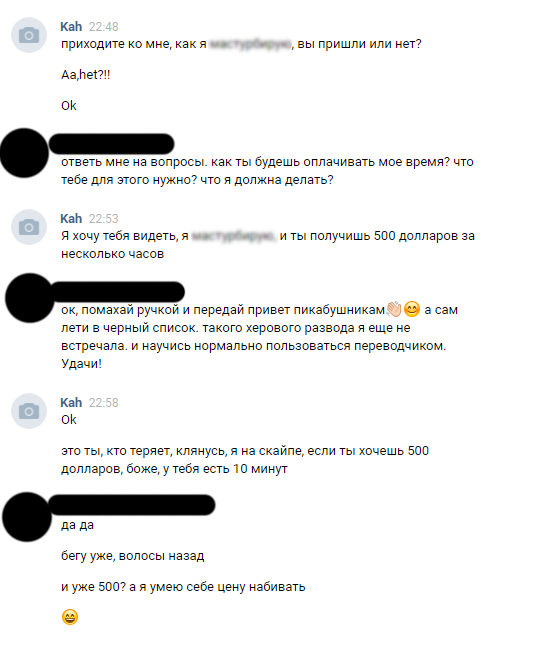 На самом деле меня пытались "развести" и никаких животных не предполагалось в принципе. То есть меня хотели раскрутить на "виртуальные игры" по скайпу - несколько моих знакомых на это уже повелись (я не знаю кем надо быть, чтобы на такое повестись) и их потом шантажировали "секс-видео". Кто-то заплатил денег шантажистам, кто-то не платил, но и в полицию не обратился.