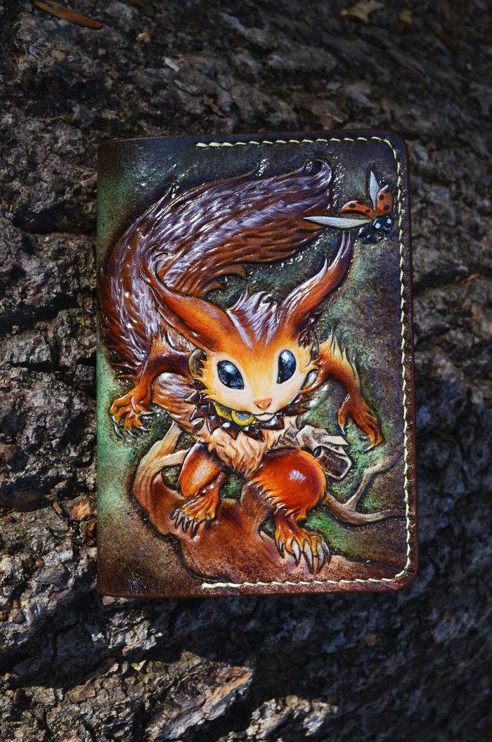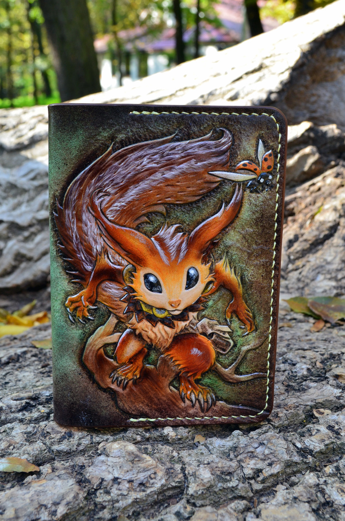 Обложка паспорта с тиснением персонажа игры Smite. Игру, к сожалению, не играл, но работа была по душе, ибо перс целиком списан с белки Рататоска (привет Скандинавия).