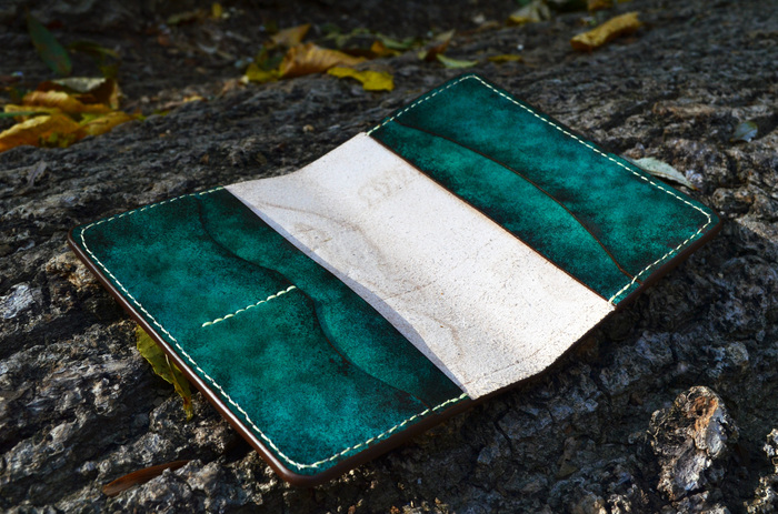 Использовал кожу растишку толщиной 1,6-2,0 мм и 0,8-0,9 мм на внутрянку. Краски спиртовые от Фибинг и Кенда, немного акрила, краска для торцов также Фибинг. Нить льняная Meisi толщиной 0,55 мм.