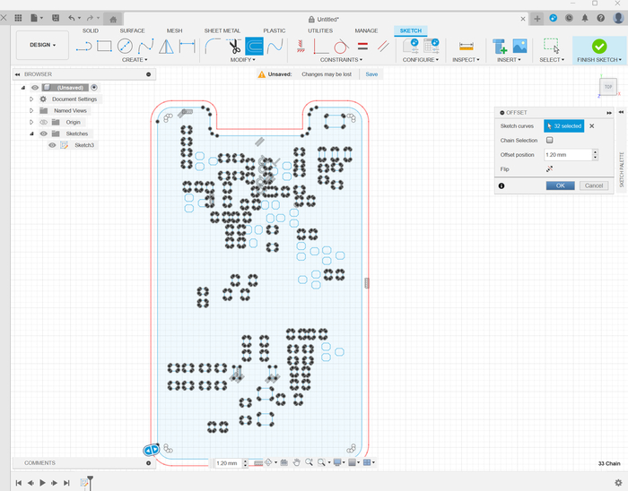 После работы с пятаками, лишние линии удаляем. И приступаем к границам платы. Выделяем все линии границы (точки соединения не выделяем, только линии), и делаем Offset на + 1.2 мм и на + 0.2 мм. Из которых 0.2 мм - это будет зазор между платой бортом трафарета и 1 мм - это толщина бортика. После чего удаляем линии изначальных границ, - они больше не понадобятся. И финишируем скетч.