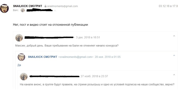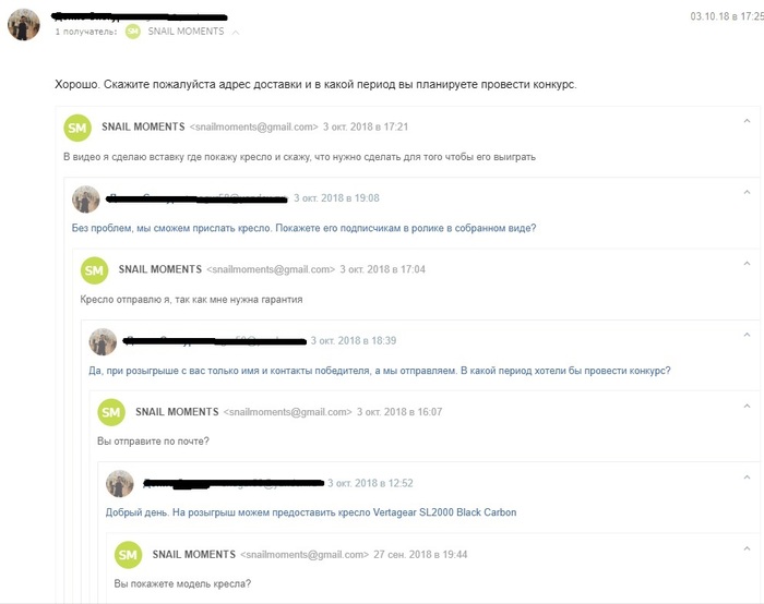 Задачей было провести совместный розыгрыш игрового кресла со SNAILKICK (Снэйлкик) и я написал ему на почту с предложением о сотрудничестве.