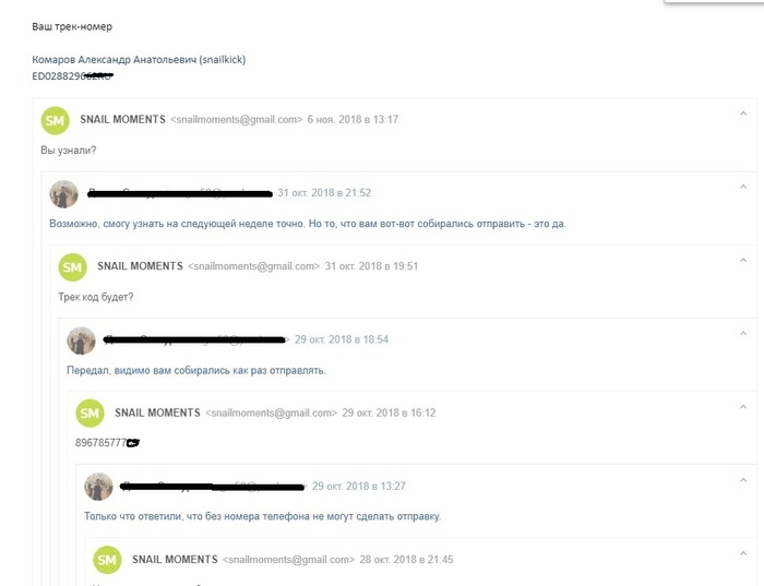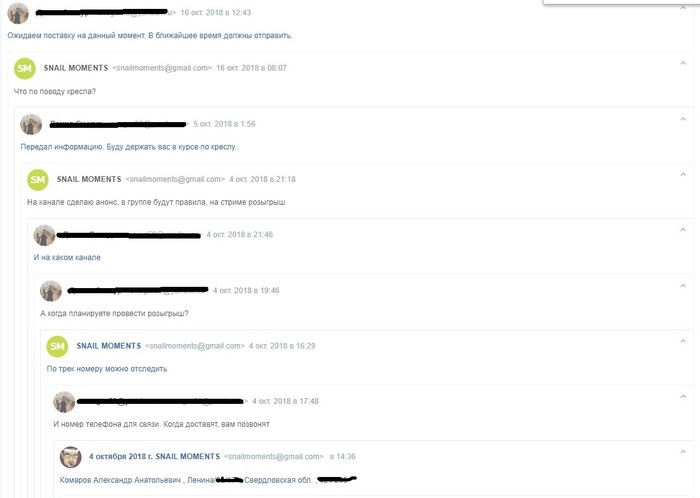 Снэйлкик указал номер телефона и спросил про трек-код, мы предоставили. Кресло отправлено и получено адресатом.