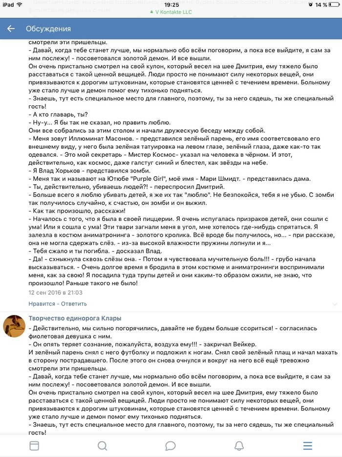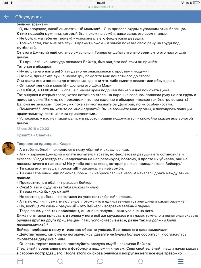 Я плохо помню, о чём писала, помню только основной сюжет, потому как такие фрагменты представляла, визуальную часть хорошо запомнила. И довольно хорошо получилось, прошло 4 года. Удивлена, что сейчас меньше совершаю грамматические ошибки, хоть и русского языка около 2 лет нет. И почти ничего среди художественной литературы не читаю. Но всё-таки что-то читаю и постоянно пишу.