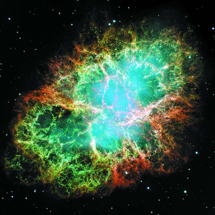 Изображения Крабовидной туманности в шести разных спектральных диапазонах: радиодиапазон, инфракрасный, видимый, ультрафиолетовый, рентгеновский и гамма-. Источники: Radio: NRAO / AUI and M. Bietenholz; NRAO / AUI and J. M. Uson, T. J. Cornwell; Infrared: NASA / JPL-Caltech / R. Gehrz (University of Minnesota); Visible: NASA, ESA, J. Hester and A. Loll (Arizona State University); Ultraviolet: NASA / Swift / E. Hoversten, PSU X-ray: NASA / CXC / SAO / F. Seward et al.; Gamma: NASA / DOE / Fermi LAT / R. Buehler.