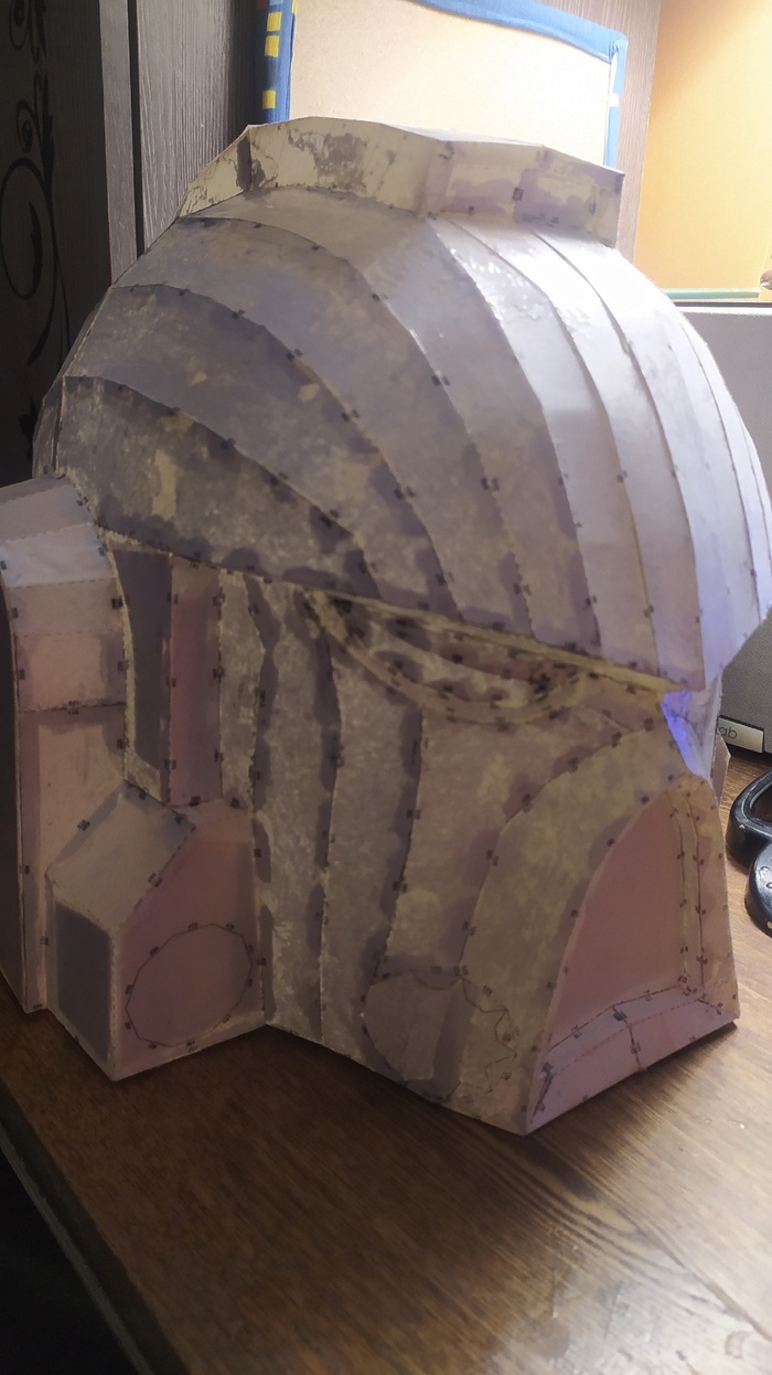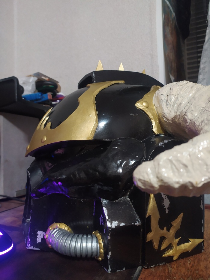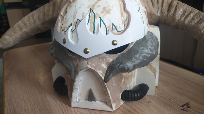 Дальше чисто творчество. Ну как: из чего собрать ту или иную деталь чтобы было похоже и вписывалось в требуемые рамки модели. Рога из туалетной бумаги нанесенной на картонную модель рогов. Укрепил эпоксидкой несколько раз чтобы придать прочности. "Скулы" так же из бумаги поверх которой наклеен эпоксидный пластилин, налобная пластина из пвх листового пластика, трубки по "классике" гофра пластиковая. Заклепки очень классно получаются из мебельных гвоздей.
