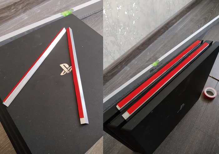 Далее мы прикидываем где будет висеть приставка и можно закрепить нижнее основание на стене. После этого нам нужно наклеить клейкую ленту на мелкий профиль и положить на приставку следующим образом (это своего рода ограничители):