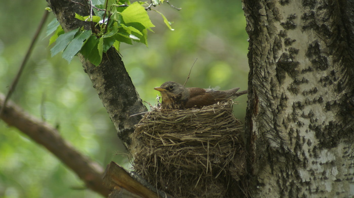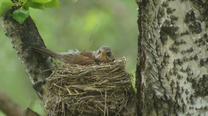 этим летом прикупил бюджетный телезум minolta 100-300.Конечно и светосила низкая и промахи бывают.Но поиграться и попробовать пойдет.Думал чтоб такое заснять, и тут напротив окна на березе заметил свежее гнездо.Я не силен в птицах,но кажется это дрозд-рябинник? Снимал со штатива.