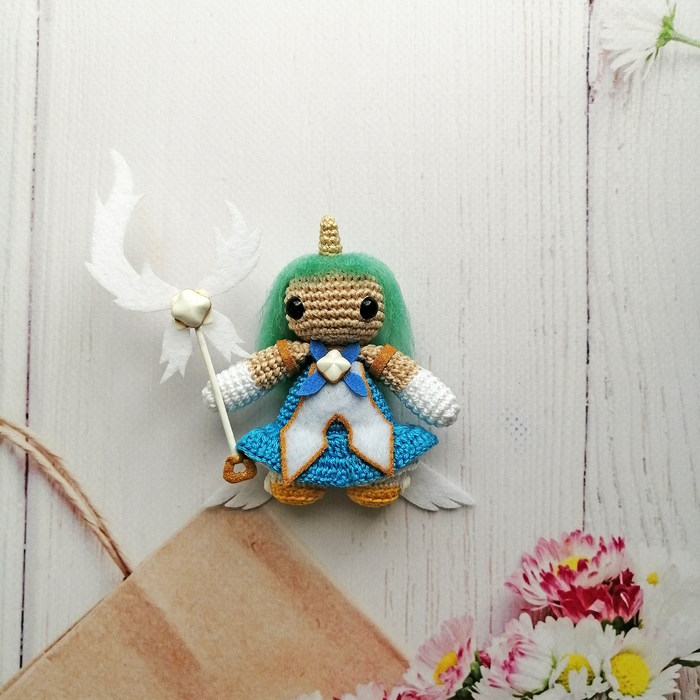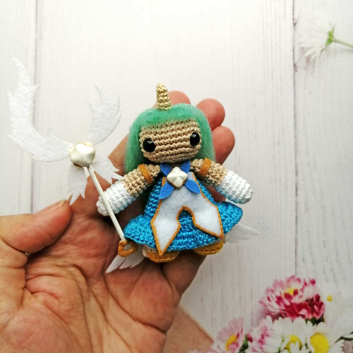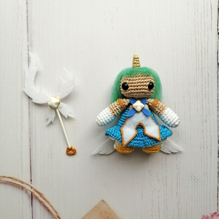 Связана из хлопковой пряжи Vita Coco, крючок 0.9 мм, оружие из полимерной глины и фетра. Размер около 7 см.