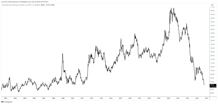 Одни эксперты успели высказаться... Кто-то еще в середине прошлого года, когда TLT упал до 115, а рынок акций начал восстанавливаться, - призывал покупать этот фонд. Кто-то осенью прошлого года у отметки 100 или зимой на отскоке к 107. Кто-то в начале этого года около 95. И вот новая волна "надо покупать" пошла в сентябре при падении ниже 95. К слову, сейчас цена TLT 88. Еще раз: речь идет о самых надежных инструментах в мире, которыми наполнен этот ETF.