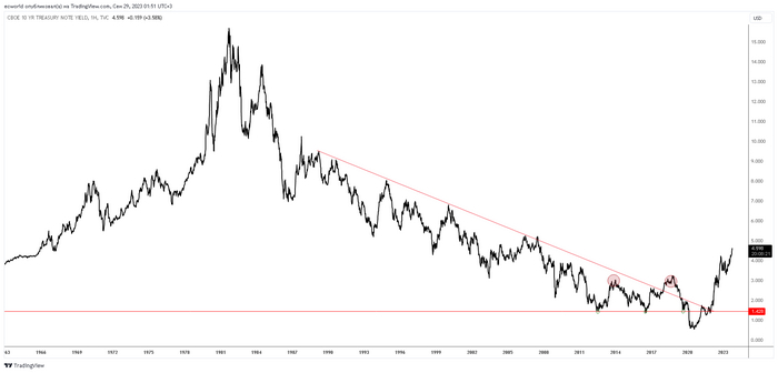 - а доходности самых надежных инструментов в мире при этом стоят у максимумов за 20+ лет. То есть такую высокую доходность (плюс-минус) самые надежные бумаги в мире показывали лишь в 2007 и 2002 годах: