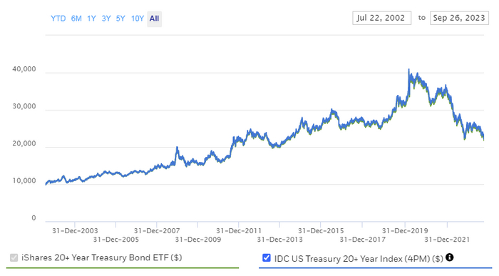 Но и этого было мало. Следом за той последней волной пришла новая волна "экспертов", которые "познали рынок" и начали хейтить тех, кто предлагал покупать TLT на протяжении движения вниз. Причина банальна: "TLT упал уже почти вдвое с 2020 года", "TLT у своих 20-летних минимумов", "зачем его брать, если надежнее брать сами гособлигации, которыми наполнен фонд, потому что ..." ... и всё это дополняется красивой картинкой падения TLT: