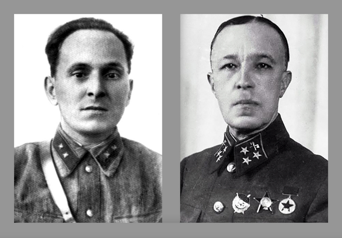 А это Дмитрий Михайлович Карбышев справа, вы знаете. А слева Сергей Иванович Солнцев, начальник разведки и комиссар партизанского отряда Рузского района Московской области.