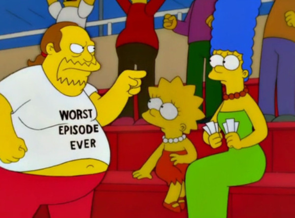 В «Симпсонах» есть такой персонаж — Продавец Комиксов. Это пародия на гиков без личной жизни, которые даже в 30 лет сохраняют подростковую любовь к комиксам и мультфильмам. Периодически Продавец Комиксов появляется в футболке с надписью «Худший эпизод», что как бы символизирует постоянные жалобы фанатов, что, мол, «Симпсоны» уже не те.