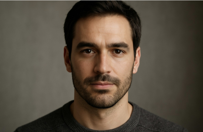 realistic portrait of 40-year-old man, chestnut hair, hazel eyes, stubble, calm look, soft daylight, neutral beige background, 8k resolution, detailed skin