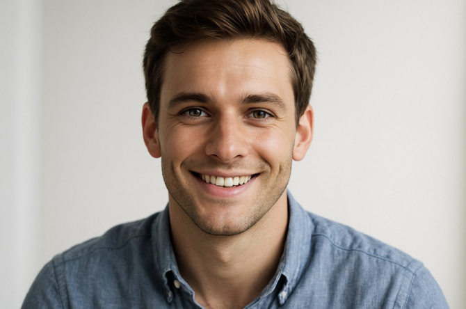 realistic portrait of charming young man, 23 years old, short dark hair, green eyes, smooth skin, доброжелательная улыбка, повседневная рубашка, естественный дневной свет, белый фон, 8k quality