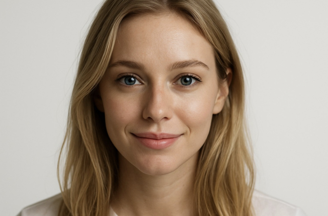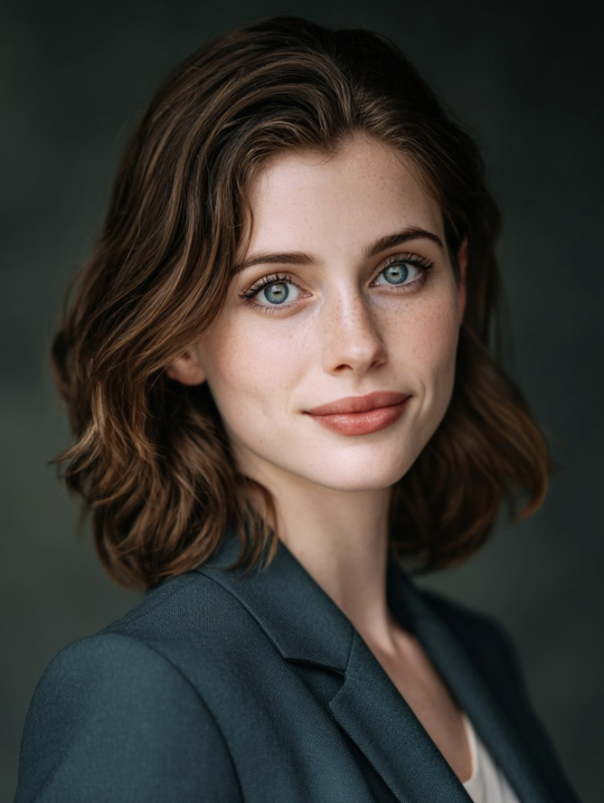 photorealistic portrait of young woman, light brown hair, green eyes, slight smile, studio lighting, plain background, high skin detail, cinematic look
