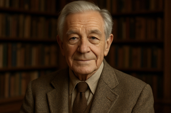 стильный портрет седовласого господина, 65 лет, морщины мудрости, доброжелательное лицо, твидовый пиджак, мягкий свет, книжные полки на фоне, фото в реалистичном стиле