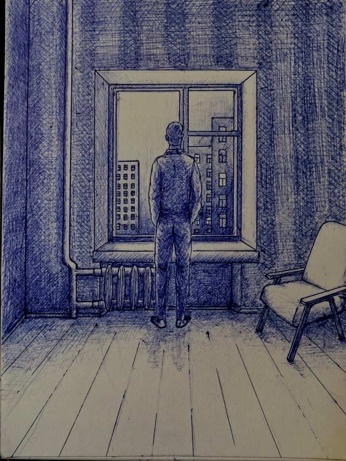 Неподвижный. Руки по швам. Голова — если это была голова — слегка наклонена вправо, как будто слушал. Или принюхивался. Или — вот эта мысль дёрнула что-то под рёбра, в мягкое, в незащищённое — смотрел. Прямо на её окно.