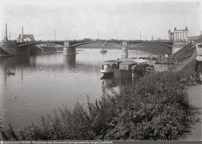 Вид с нынешней Фрунзенской набережной на старый Крымский мост во время весеннего половодья, 1924. То есть сейчас справа располагается ПКиО им. Горького. Автор фото: А.А. Губарев. С сайта www.pastvu.com.