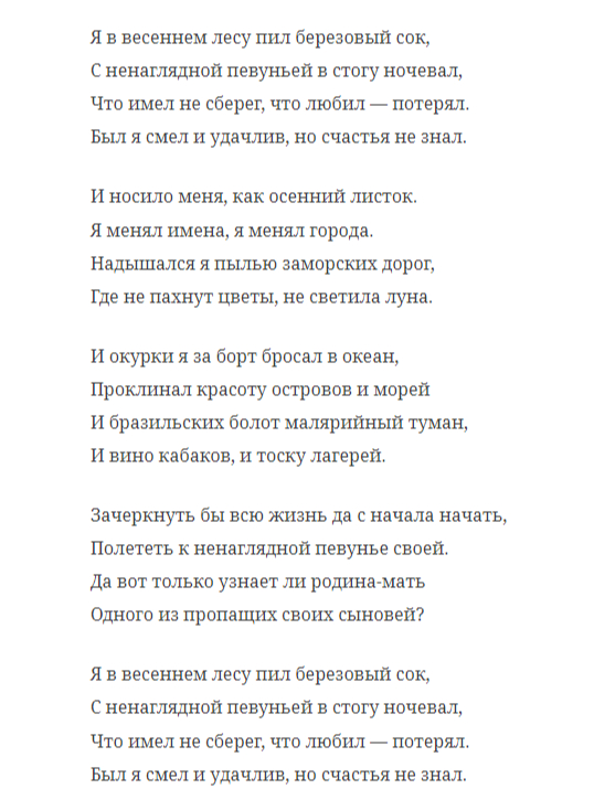 Текст песни — исповедь оторванного от Родины человека, который и рад бы вернуться, но вовсе не уверен, что дома ему будут рады. Недостижимое счастье — в прошлом, в краю берёзового сока, но герою приходится менять города и имена, дышать пылью чужих дорог и проклинать заморские красоты.