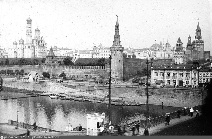 Давайте посмотрим, как Москва-река выглядела в исторической местности Дорогомилово. Набережные тогда ещё не были отделаны гранитом, да и грандиозных сталинских домов тут пока не построили.