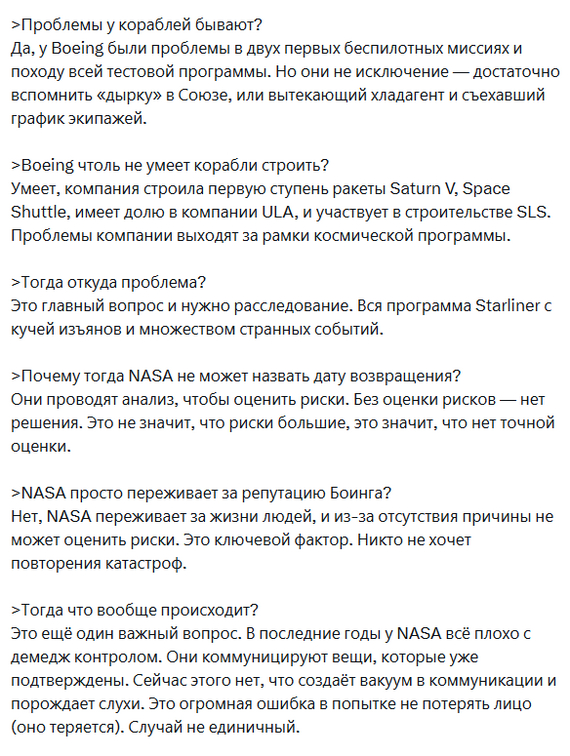 «Он выразил мне намерение, что они продолжат устранять проблемы, как только Starliner благополучно вернется», - сказал Нельсон, но добавил, что не обсуждалось, согласится ли Boeing взять на себя расходы на дополнительный испытательный полет для сертификации транспортного средства для доставки астронавтов на Международную космическую станцию и обратно.