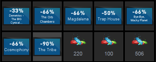 Ниже представляю цены игр уже с учётом скидки и наличие карточек (+,-),время действия купона: