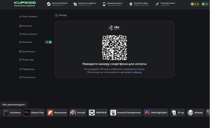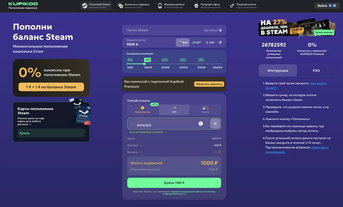 Kupikod Premium - самый выгодный сервис для пополнения Стим с комиссией 0%
