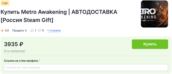 На сайте GGSel нажимаем на поисковую строку и ищем «Metro: Awakening». Находим нужный нам товар. Помимо цены рекомендуем обращать внимание на продажи, отзывы и рейтинг продавца.