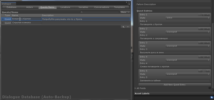 Так в поисках подходящего инструмента мы и наткнулись на Dialogue System for Unity. Во время поиска, перебирая разные варианты мы смотрели не только на технические возможности, но и насколько он удобен для наших Летописцев. Поэтому сформировали определенный набор требований.