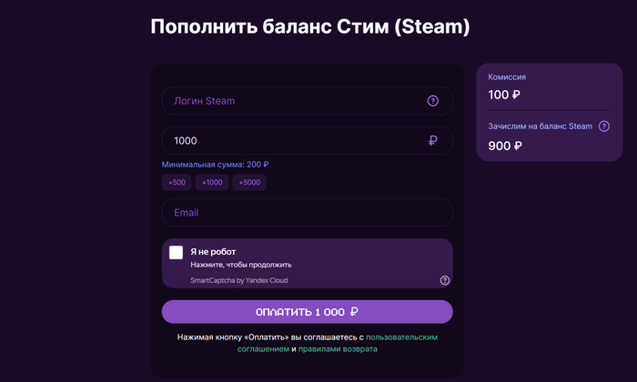 Вы указываете публичный логин Steam-аккаунта, вводите сумму, на которую хотите пополнить баланс для покупок на распродаже игр Стим. Система автоматически показывает итоговую сумму зачисления с учётом комиссии. После оплаты средства отправляются на кошелёк Steam, зачисление обычно занимает 1-5 минут.