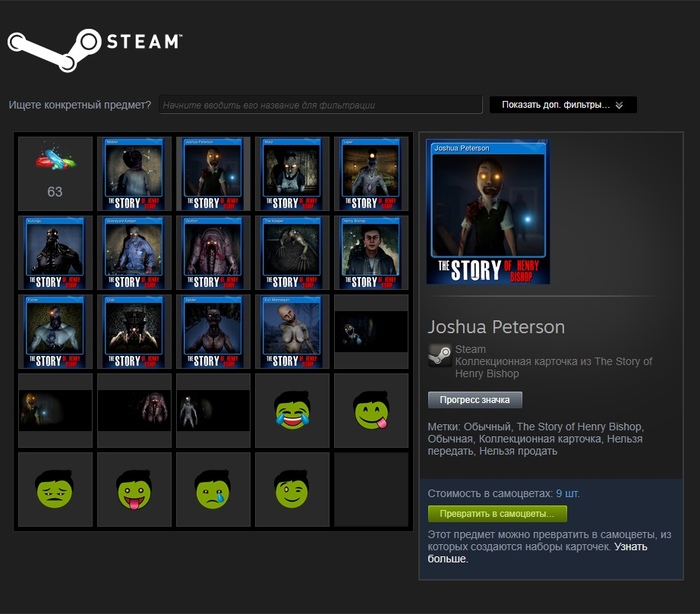 Хотелось бы упомянуть, что на старте выпуска игры Steam не дает возможности выпускать коллекционные карточки, значки, фоны, смайлы. Эта возможность появляется лишь тогда, когда игра превысила определенное количество продаж и запусков игры(так указано в документации). У меня карточки одобрили когда запусков игры было чуть больше 2к, продано копий около 3к. Это на заметку разработчикам. А то я сам искал информацию о карточках и негде и не нашел сколько хоть примерно должно быть.