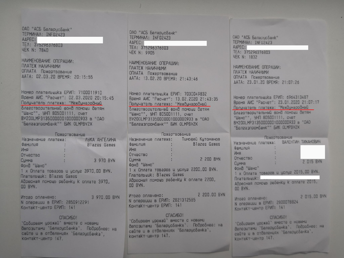 Почти 4 000$ были переведены в белорусский фонд "Шанс" (очень прозрачный фонд который лично у меня вызывает только доверие) на лечение 3-х детей. Их имена указаны в чеках. И еще 1000$ отложена на реабилитацию еще одного ребенка и будут переданы родителям в руки лично, чек будет предоставлен немного позже в группе в вк, при оплате лечения. Обращаю внимания, что оплата производилась не RUR, а BYN(белорусские рубли)