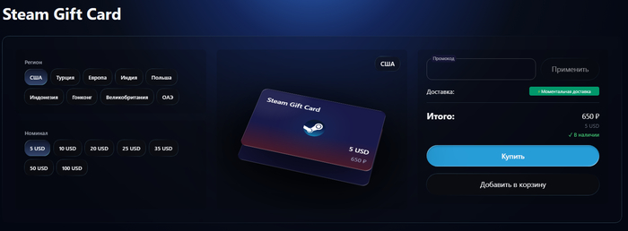 Сервис также предлагает подарочные карты Steam и различные регионы пополнения. Подходит тем, кто хочет провести оплату Стим максимально прямо и без лишних шагов.