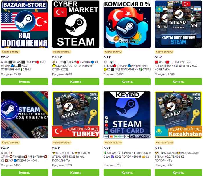 Подарочные карты — более интересный способ. Коды пополнения продаются для разных стран и могут быть даже выгоднее, чем услуги продавцов. После оплаты вы получаете код и активируете его в личном кабинете Steam, после чего деньги сразу зачисляются на ваш баланс. Минус способа в том, что пополнение возможно только на фиксированные суммы.