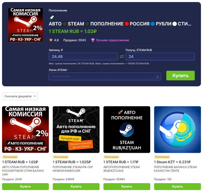 Комиссия на пополнение Steam начинается от 2%. Но периодически продавцы устраивают акции, во время проведения которых комиссия снижается до 0%.