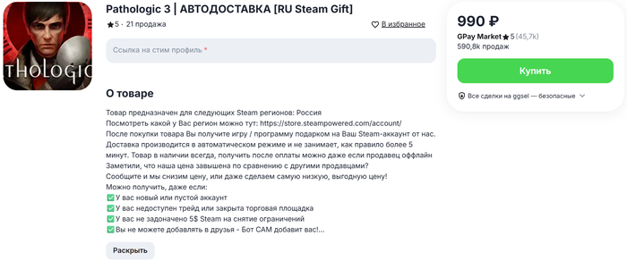 Также можно выбрать активацию игры на аккаунт зайдя на страницу Pathologic 3 на площадке ggsel. Вводите свои данные от учетной записи PSN в переписке с продавцом и он сам совершит покупку игры! Вам остается только зайти на аккаунт после операции продавца и установить Pathologic 3 на свою консоль.