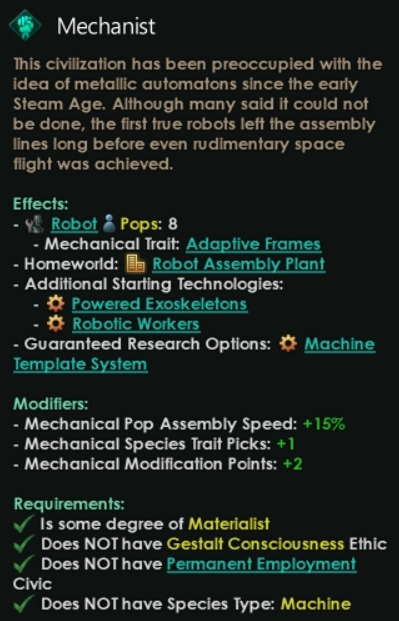 «The Machine Age» также позволит вам создавать империи машин, не относящихся к гештальт-сознанию. То есть использующих обычные формы правления, этики и модели. Эти индивидуалистические машины не управляются общим гештальт-интеллектом, и поэтому у них есть свои собственные мотивы, желания и поводы для грусти. Отдельные машины обладают счастьем, как полностью признанные синтетики, могут и хотят создавать фракции и потреблять ТМС.