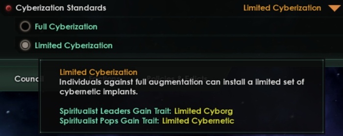 Поскольку наши машины индивидуальны, они не имеют ограничений на включение органиков в свои империи и даже могут начать игру с «синкретической эволюцией». Эти машины имеют доступ к технологиям производства пищи, генетической модификации и прочим технологиям, ориентированным на органиков. У вас будет резко сниженный, но всё же не нулевой шанс получить эти технологии, если в вашей империи нет органиков. Вы всё же способны теоретизировать о мясе и его потребностях в отличие от гештальт-машин.
