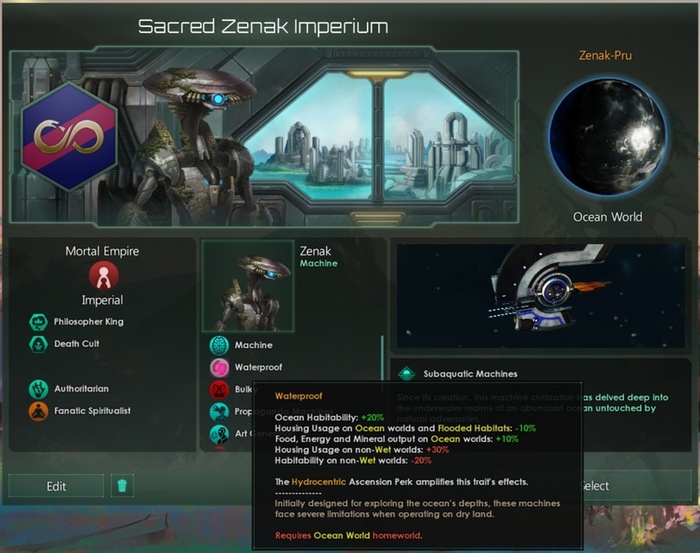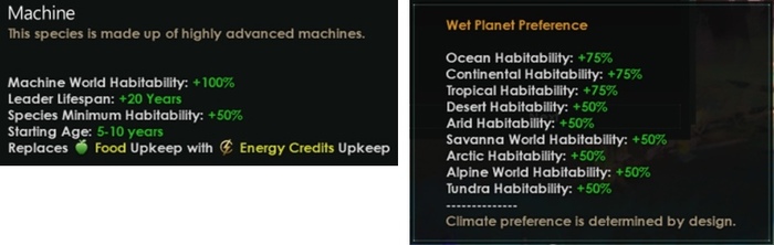Машины с происхождений вроде «Тепличные» или «Подводные» начнут с приспособленностью к идеальным или океанским мирам и должны будут исследовать технологию, чтобы изменить свой признак обитаемости, но сохранят 50%-ный уровень минимальной пригодности, поскольку являются машинами.