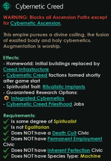 Вам доступны все этики, так что вы можете быть спиритуалистами, способными обосновать своё духовное превосходство над другими машинами и органиками. Ваши фракции были скорректированы, чтобы получше соответствовать вашему механическому существованию, поскольку роботам-спиритуалистам нет смысла презирать всех роботов. (Но некоторых можно).