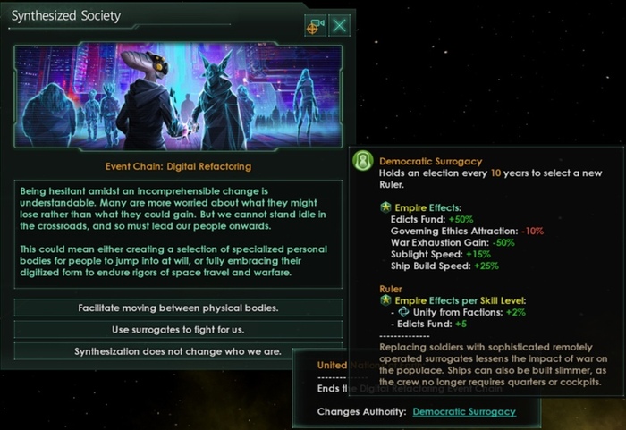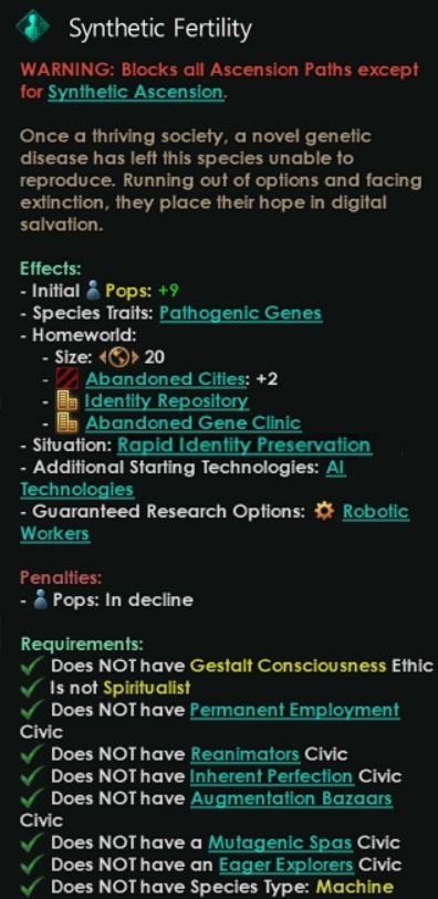 В дополнении индивидуалистические и гештальт-машины получают доступ к 3 новым путям вознесения (которые заменяют текущее древо синтетиков). Взяв перк «Синтетический век», вы начнёте новую ситуацию, который позволит провести ваш механический народ через эту судьбоносную трансформацию