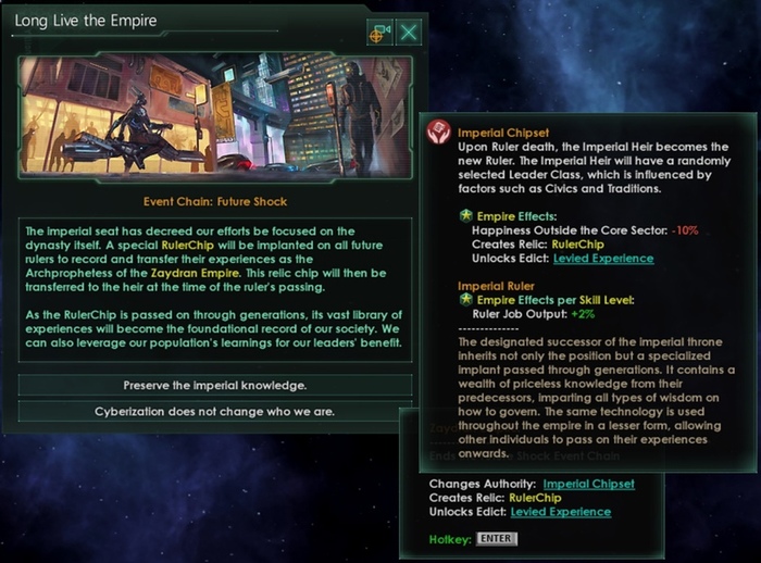 Как органические империи, что превращаются в синтетиков, так и империи машин также сбросят свой возраст после завершения вознесения, чтобы отразить получение новых тел. Как ни парадоксально, но вместе все эти изменения должны привести к тому, что ваши лидеры-машины станут куда более стойкими ко времени, чем когда они теоретически считались «бессмертными».