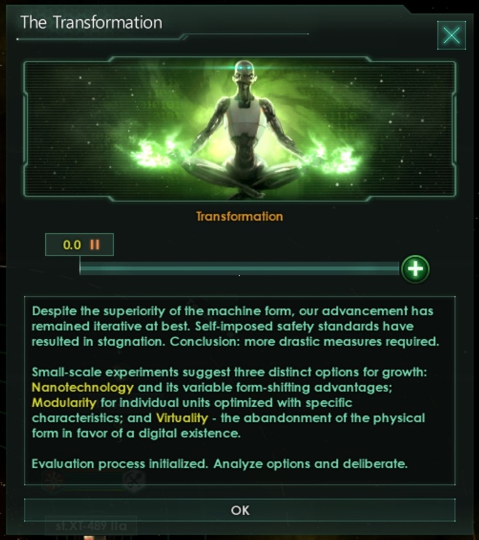 Сегодня мы рассмотрим некоторые общие изменения геймплея, сделанные для машинных империй и индивидуалистических машин, а также на новые пути вознесения для них. Работа ещё не завершена, так что к релизу некоторые иконки и цифры изменятся.